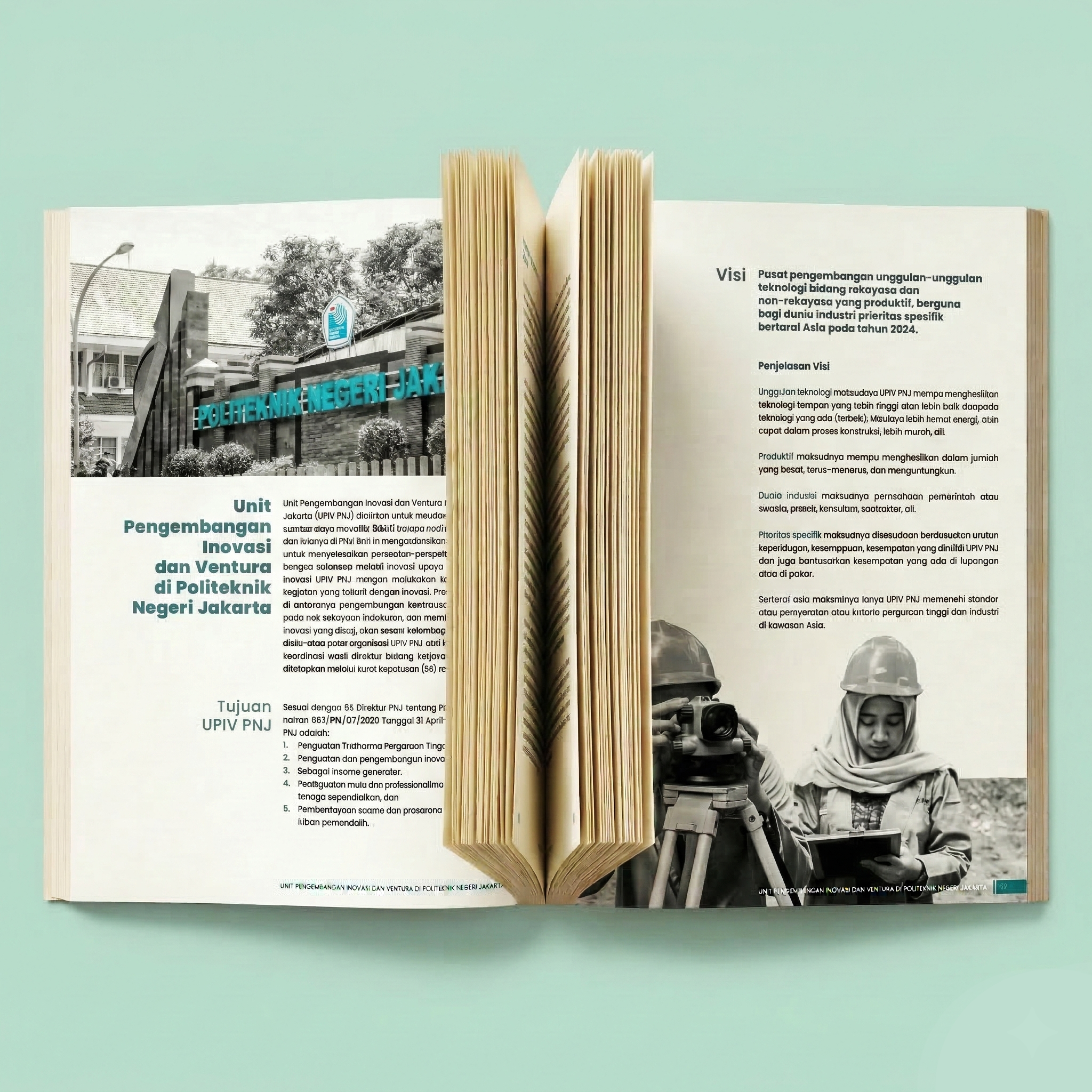 This design projects a professional and innovative image that perfectly represents Politeknik Negeri Jakarta (PNJ) as a modern vocational institution. By blending iconic campus imagery with visuals of technical fieldwork, it creates a powerful narrative of theory meeting practice, while the clean layout ensures the institution’s strategic vision is communicated clearly to industry audiences.
